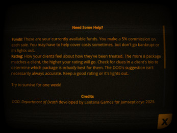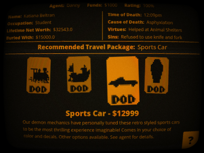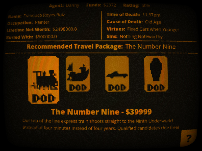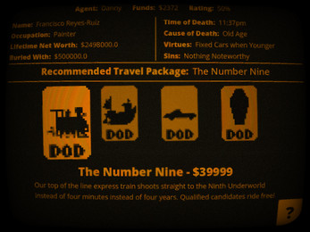 You are the newest travel agent at the Department of Death, a grim reaper licensed to help souls find their way to the final afterlife. Sell your clients the best travel packages to the Ninth Underworld that they can afford, or help cover some of their costs. Avoid going into debt or getting too low a rating or it's lights out for you!